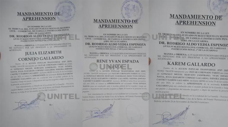 Son cuatro las ordenes de aprehensión que fueron emitidas por un juzgado de La Guardia que dispone la aprehensión de los magistrados Gonzalo Miguel Hurtado Zamorano, René Yván Espada Navia, Julia Elizabeth Cornejo Gallardo y Karem Lorena Gallardo Sejas.